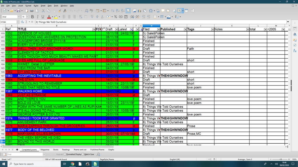 I started using one at work and found it useful and fun. Once I went on an advanced spreadsheet course and found there was just me and the tutor. No surprise therefore to learn I keep a spreadsheet (with at least six pages) to keep track of my poems and I have over a 1,000 mainly failed attempts at a poem but I like to keep everything. I have one sheet which is just a list of poems written (including when, date revised, draft or finished or published and sometimes a brief description eg ekphraistic); another which is a list of magazines including the year/month it was sent; another a list of the magazines sent, date sent and date returned, comments, accepted or not, and another part of the sheet with the magazine, date sent and poem number(sorted by that); a simple list of poem published and where; plus two other sheets for pamphlets sent to publishers and reading attended.