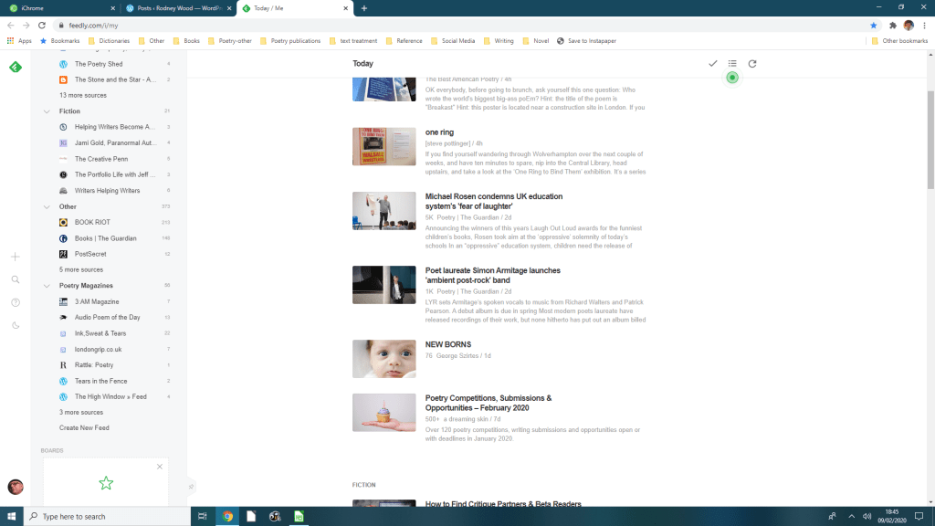 A useful webite or app is Feedly.com which allows you to list your favourite websites you want to read. So I have all my favourite blogs and poetry magazines in one place.