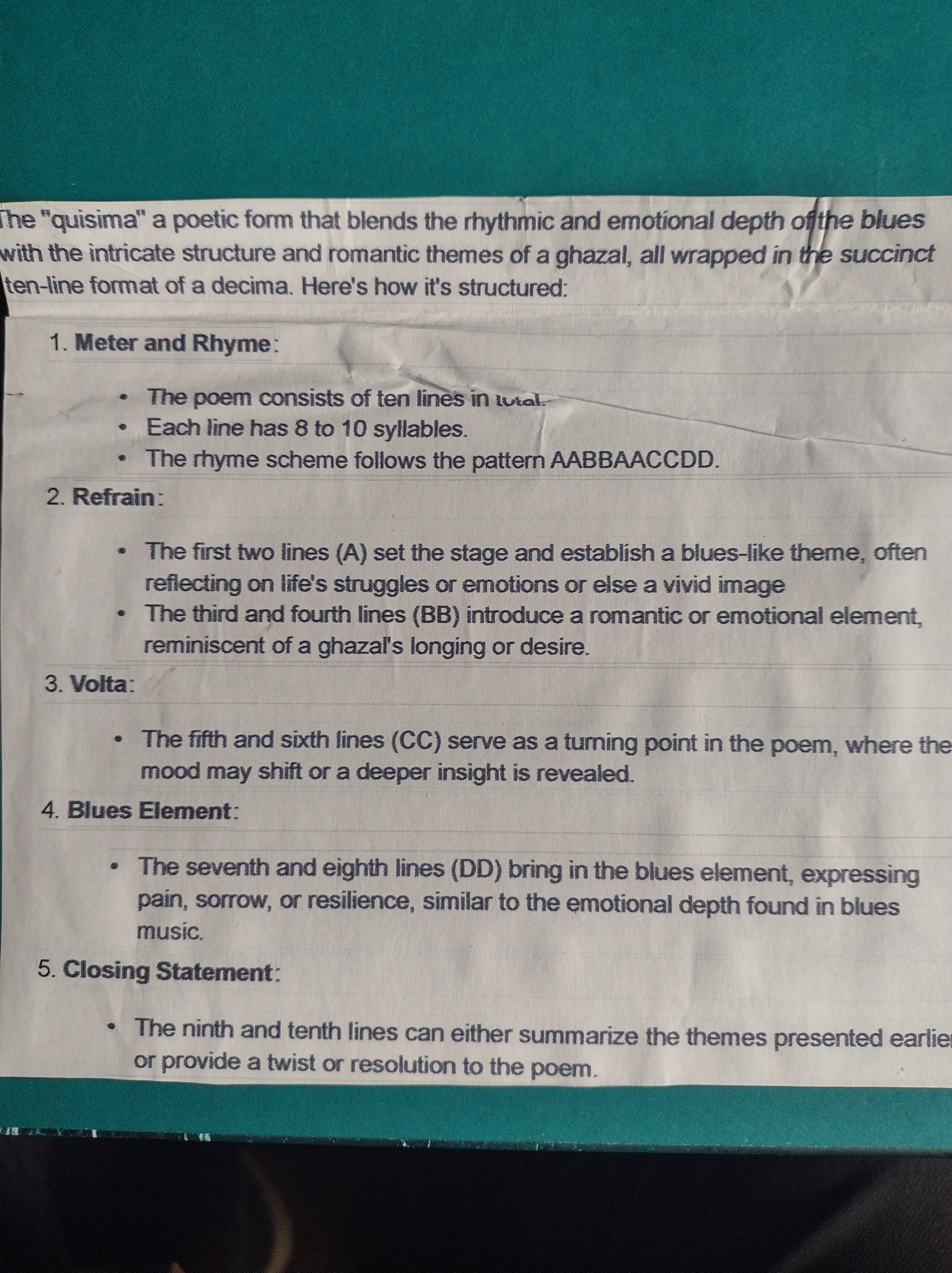 My journey to this form wasn’t straightforward. First attempts were too rigid, trying to force every element – blues, ghazal, haiku – into strict coordination. The poems felt mechanical, like they were assembled rather than written. Then I went too far the other way, making the structure so loose it provided no guidance at all. I filled pages with variations, testing different line lengths, playing with where to place the emotional turns. Some versions emphasized the blues elements but lost the lyrical qualities of the ghazal; others maintained formal precision but felt emotionally flat. Each failure taught me something about what I was really seeking: not a cage to contain the poems, but a trellis to help them grow.